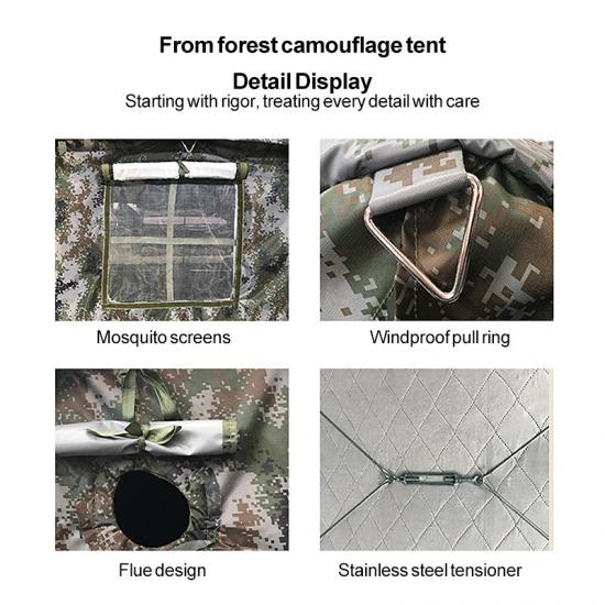 Diperbuat daripada bahan berkualiti tinggi, ia boleh menahan penggunaan kerap dan ujian persekitaran yang keras. Khemah Penyamaran yang tahan lama untuk kecemasan boleh digunakan untuk masa yang lama.