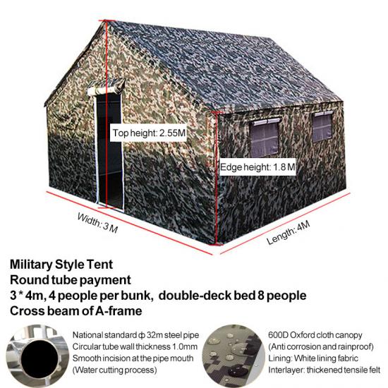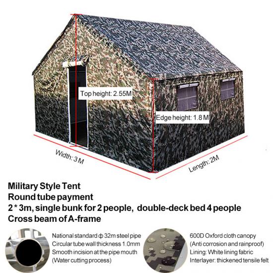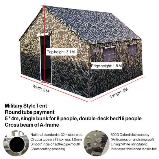 Khemah kecemasan YRF Camouflage diperbuat daripada bahan kalis air PVC dan dilengkapi dengan rangka taufan aluminium. Ia menyediakan tempat perlindungan sementara yang boleh dipercayai untuk kecemasan dan sesuai untuk pelbagai senario kecemasan. Khemah Penyamaran tentera ini direka khas untuk situasi kecemasan. Dengan keluasan 40 meter persegi, ia dapat menyediakan ruang yang luas untuk orang ramai. Ia mempunyai prestasi kalis gempa bumi yang sangat baik. Apabila bencana seperti gempa bumi berlaku, ia boleh menyediakan tempat perlindungan sementara yang selamat dan boleh dipercayai untuk mangsa bencana dan penyelamat. Ia adalah bahan utama yang sangat diperlukan dalam senario kecemasan.