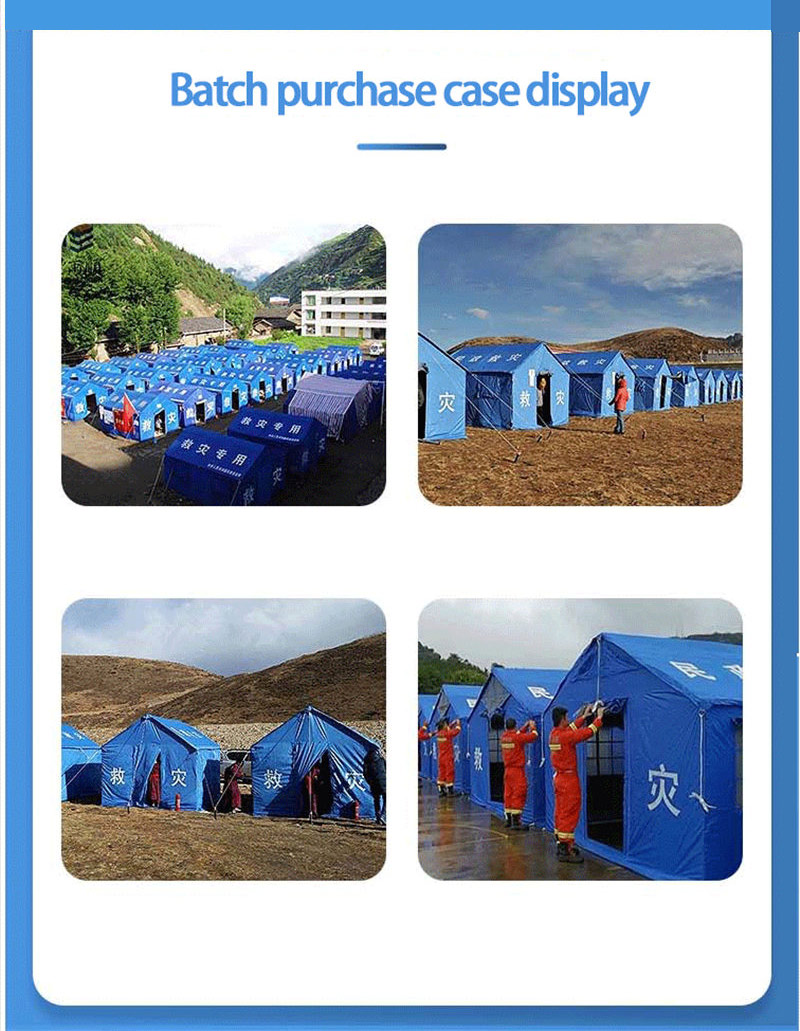 Khemah Kecemasan adalah penyelesaian terbaik untuk pelbagai senario kritikal. Dalam bantuan bencana kecemasan, ia melindungi mereka yang terlantar selepas gempa bumi atau banjir. Tentera menggunakannya untuk segera menubuhkan pangkalan di kawasan terpencil. Pasukan perubatan mengubahnya menjadi hospital sementara. Ia juga merupakan ruji dalam program bantuan Pertubuhan Bangsa-Bangsa Bersatu, sumber kecemasan yang disimpan kerajaan, dan usaha bantuan Palang Merah. Dengan pelbagai pilihan warna yang tersedia, anda boleh memilih mengikut keperluan anda. Persediaan mudah memastikan penggunaan pantas dalam kecemasan. Bahagian dalamannya yang besar boleh memuatkan banyak bekalan dan memuatkan ramai orang. Ia benar-benar produk yang penting dan boleh dipercayai untuk sebarang situasi kecemasan.