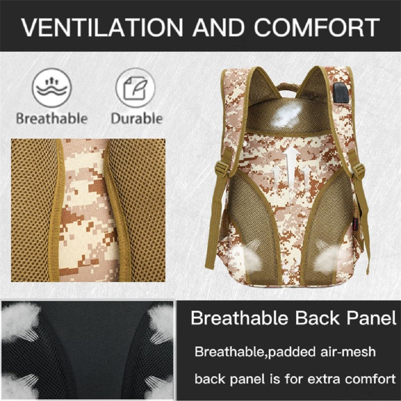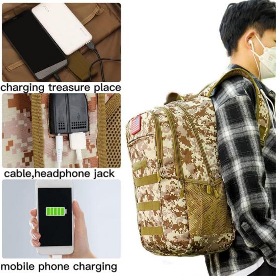 Tali Ransel Bantuan Bencana Awam Tentera Tahan Lama dilengkapi dengan port USB dwi-port dan kabel pengecasan terbina dalam, yang memudahkan anda mengecas telefon bimbit anda pada bila-bila masa tanpa perlu risau tentang kekurangan kuasa. Sementara itu, bicu fon kepala dan port USB direka bentuk sebelah menyebelah, supaya anda boleh menikmati muzik semasa mengecas.