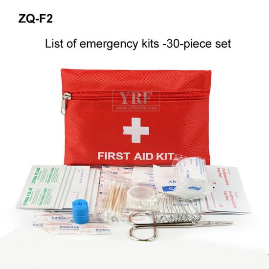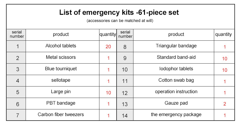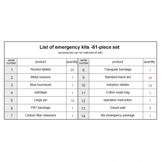 Tablet alkohol *20, Gunting logam *1, Tourniquet biru *1, Pita *1, Pin besar *10, Pembalut PBT *1, Pinset gentian karbon *1, Pembalut segi tiga *1, Band-Aid Standard *10, tablet Iodophor *10, Beg sapu kapas *1, Arahan penggunaan *1, Pad kasa *2, Kit kecemasan *1 |