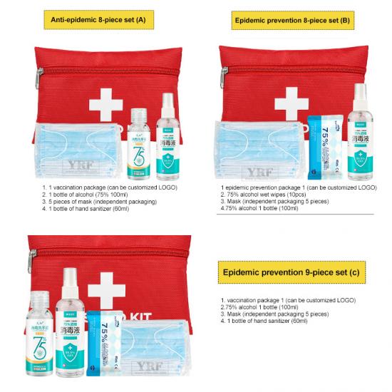 1. 1 pakej pencegahan wabak (LOGO boleh disesuaikan), 2. botol alkohol 2.75% (100ml), 3. Topeng (5 keping dibungkus secara individu), 4. 1 botol pembersih tangan (60ml)