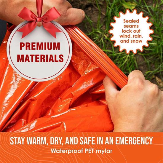 J: Beg Tidur Kalis Air Penyelamat Kecemasan bahan reflektif unik memantulkan dan mengekalkan haba badan secara berkesan, memastikan pengguna tetap hangat pada malam yang sejuk.
