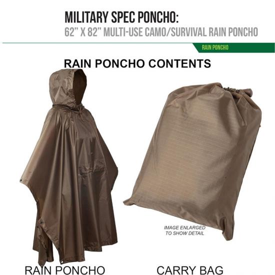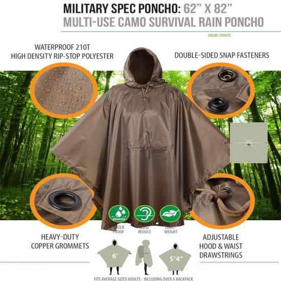 Pelapik Poncho Penilaian Kalis Air 3000mm diperbuat daripada poliester ripstop berketumpatan tinggi dan fabrik bersalut poliuretana dengan penarafan kalis air 3000mm yang sangat baik. Ponco berukuran kira-kira 59" lebar dan 86" panjang keseluruhan, cukup lebar untuk memuatkan beg galas yang lebih besar. Beg pembawa adalah lebih kurang 6" x 8" x 3". Jumlah beratnya ialah 18 auns dan hud tali boleh laras memberikan kesesuaian yang selamat dan selesa. Ponco juga mempunyai tali serut boleh laras dengan bukaan tudung berdiameter 9", memudahkan pengguna melaraskan mengikut keperluan.