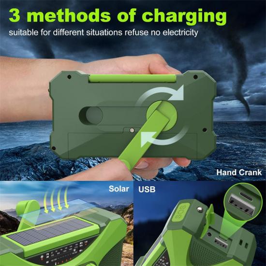 Radio Tahan Lama Bantuan Banjir mempunyai bateri boleh dicas semula berkapasiti tinggi 10000mAh terbina dalam, mampu mengecas lebih daripada 2 telefon bimbit. Radio ini juga menawarkan tiga pilihan sandaran bateri: pengecasan jenis-C untuk kegunaan harian, pengecasan penjana engkol tangan dan pengecasan suria kecemasan. Ini bermakna tidak kira di mana anda berada, anda boleh yakin bahawa Radio Ringan Bantuan Banjir akan terus berfungsi, memberikan anda maklumat dan pencahayaan kritikal.