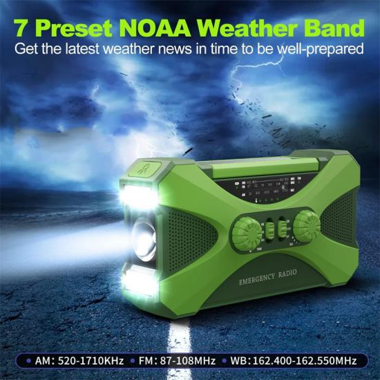 Radio Cuaca, Sumber Kuasa Berbilang, Lampu Suluh, Lampu Baca, Pengecas Telefon Bimbit, Penggera SOS, Radio AM/FM/WB Mudah Alih dengan Bicu Fon Kepala |