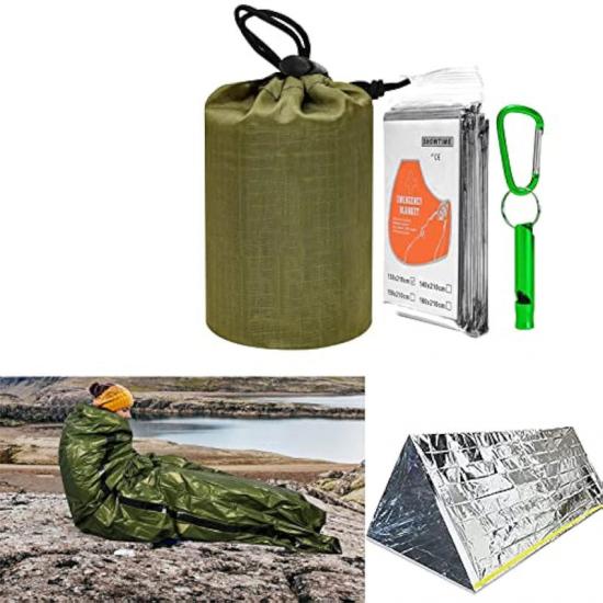 Survival First Aid Sleeping Bag Nylon ringan ini sesuai untuk menyelamat di luar. Ia diperbuat daripada bahan yang memantulkan dan mengekalkan haba badan, membantu mengelakkan hipotermia dan memanaskan badan. Untuk hari hujan atau bersalji, beg tidur diperbuat daripada fabrik kalis air atau kalis hujan untuk memastikan anda kekal kering semasa anda berada di luar rumah.