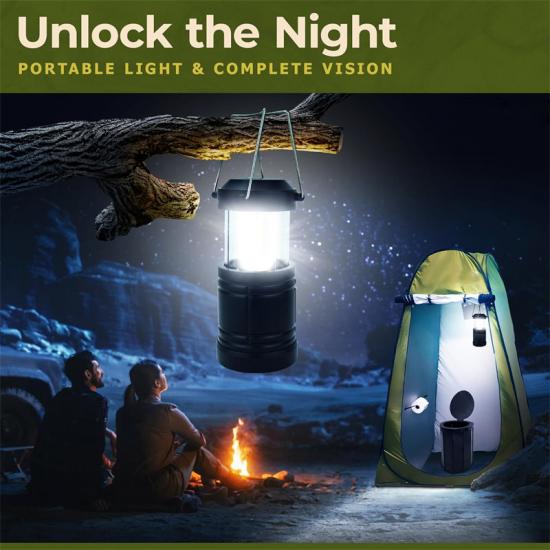 Selain menyediakan privasi asas, bahagian dalam Khemah Harga Murah Mudah dilipat dilengkapi dengan lampu LED untuk memudahkan penggunaan dalam gelap. Beg sampah tandas juga disertakan untuk menjaga kebersihan persekitaran.