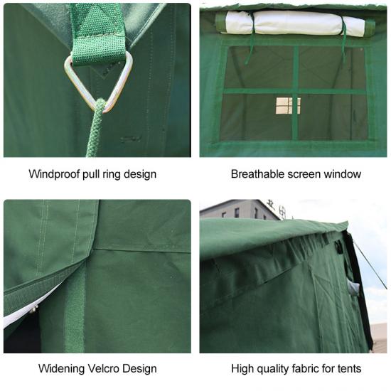 Sokongan stabil: Bingkai aloi kuat. Ia boleh dibina secara stabil di atas rupa bumi yang kompleks untuk menyokong khemah.