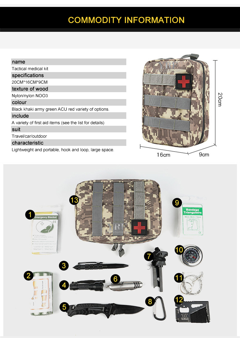 kit perubatan taktikal, keperluan perkhemahan, pejabat, perubatan motosikal, pemasangan dinding, memburu, bilik darjah, percutian, kumpulan muzik, keluarga,