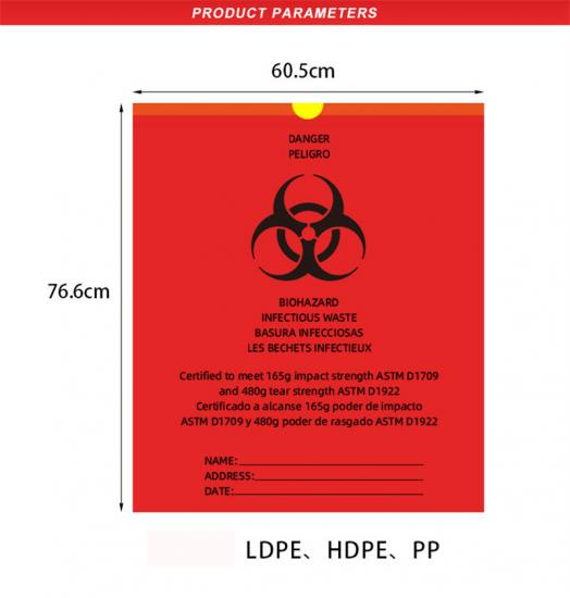 Beg simpanan sementara sisa hospital ini menggunakan reka bentuk tali serut yang inovatif, direka khas untuk institusi perubatan menyimpan sementara sisa perubatan. Diperbuat daripada bahan polietilena berketumpatan tinggi (HDPE), dengan ketebalan 0.07mm, menampilkan kekuatan tegangan dan rintangan tusukan yang sangat baik, dengan berkesan menghalang kebocoran sisa perubatan dan penyebaran pencemaran. Reka bentuk tali serut membolehkan tarik ke rapat, meningkatkan kecekapan pengedap sebanyak 70%, dengan pengedap yang boleh dipercayai dan selamat, memenuhi keperluan ketat penyimpanan sementara sisa perubatan. Produk ini mematuhi Peraturan Pengurusan Sisa Perubatan dan piawaian GB 19217-2011, lulus pensijilan sistem pengurusan kualiti peranti perubatan ISO 13485 dan ujian SGS, selamat dan mesra alam. Menyediakan pelbagai spesifikasi dan pilihan warna, memenuhi keperluan berbeza dari pelbagai jabatan hospital. Sangat sesuai untuk penyimpanan sementara sisa perubatan hospital, pemindahan sisa dan senario pengurusan klasifikasi, pilihan profesional untuk institusi perubatan untuk menyeragamkan pengendalian sisa perubatan, membantu kawalan jangkitan hospital dan perlindungan alam sekitar.