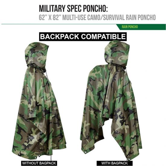J: Pelapik poncho Land Force berukuran kira-kira 59" lebar dan 86" panjang keseluruhan.