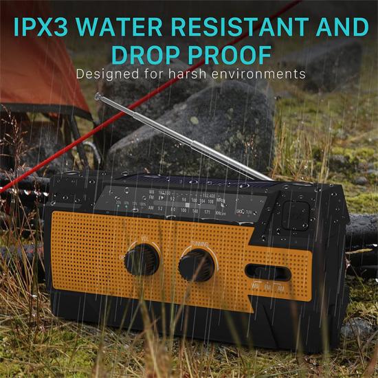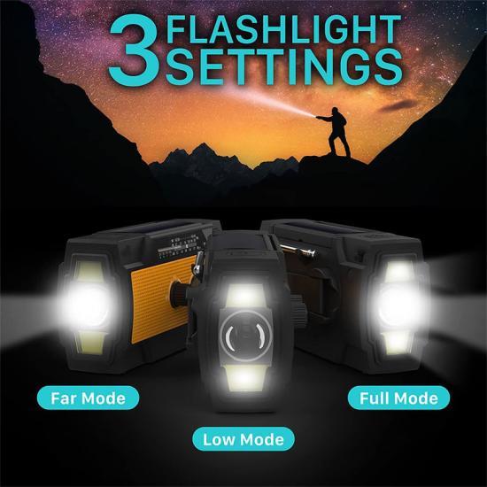 Simpanan kerajaan Bateri Radio AAA Dengan bateri 2000mAh terbina dalam, Radio Kecemasan menyediakan kuasa kecemasan untuk mana-mana tablet kecil atau telefon mudah alih dan menerima ramalan cuaca kecemasan terkini dan siaran berita kecemasan daripada stesen radio NOAA dan AM/FM dengan pasti. Radio Engkol juga menyediakan 4 lampu LED dan obor 1W untuk memberikan output yang mencukupi untuk memastikan anda dan orang yang anda sayangi keluar daripada kegelapan semasa kecemasan.