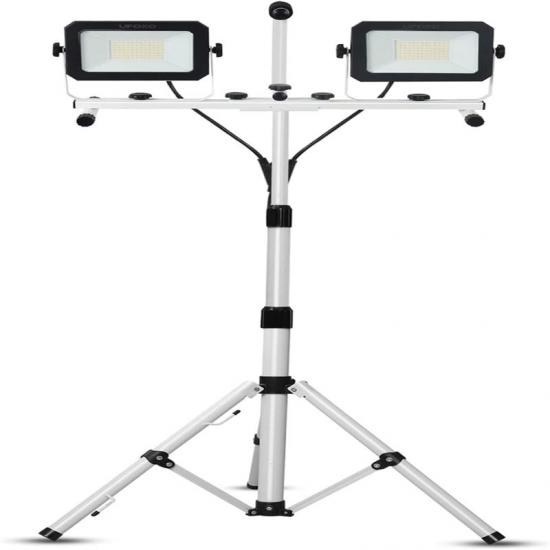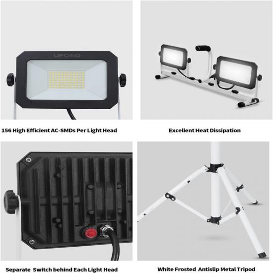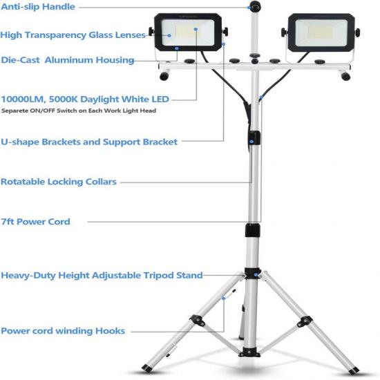 Lampu kecemasan mempunyai 5000 lumen setiap topi dan 5000K cahaya putih kilat. Tripod teleskopik memanjang dari 33" hingga 70". Setiap kepala boleh dipusing 360° secara mendatar dan condong 270° secara menegak untuk melaraskan sudut pencahayaan yang dikehendaki. Lampu kerja dwi kepala dengan pemegang boleh ditanggalkan untuk kegunaan bersendirian, menghapuskan keperluan untuk tripod.