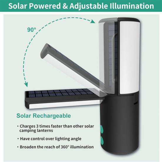 Reka bentuk 90° bagi tiga panel solar boleh laras: Lampu Kecemasan Mudah Alih Tentera dilengkapi dengan 3 panel solar boleh laras, bukan sahaja ia boleh dicas oleh tenaga suria, tetapi juga reka bentuk boleh larasnya membolehkan anda mengembangkan liputan pencahayaan 360° dengan mudah dan melaraskan sudut pencahayaan mengikut keperluan.