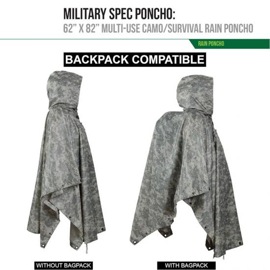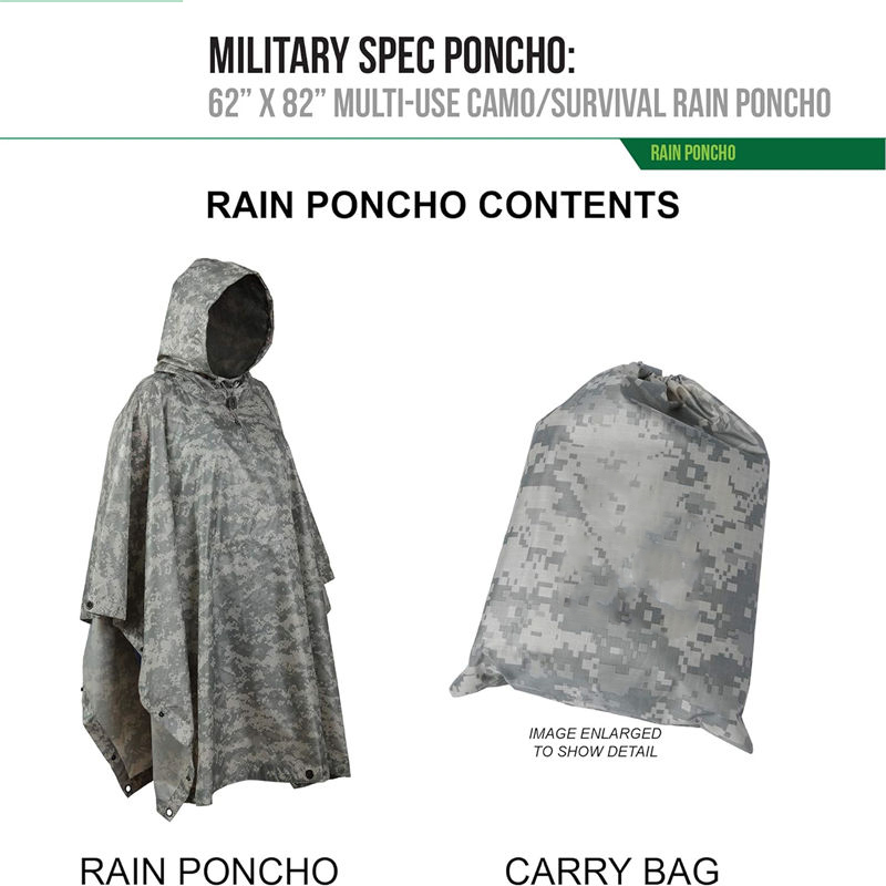 J: Hujan Kejuruteraan Pelapik Poncho memberikan perlindungan kering daripada unsur-unsur dalam cuaca buruk dan boleh digunakan sebagai tempat perlindungan hidup.