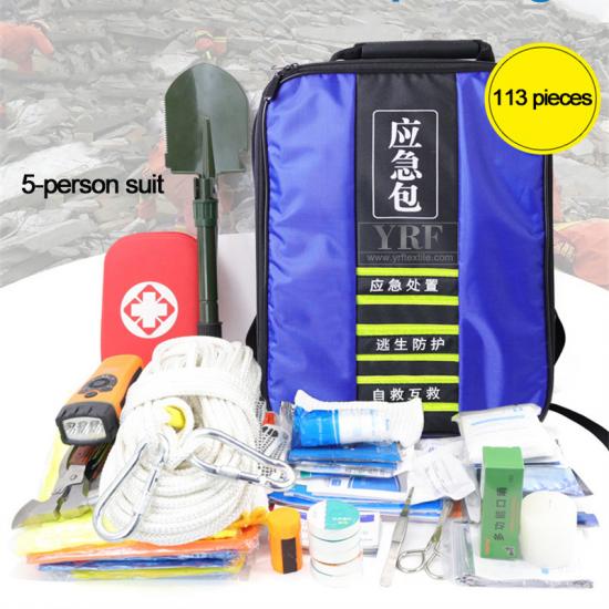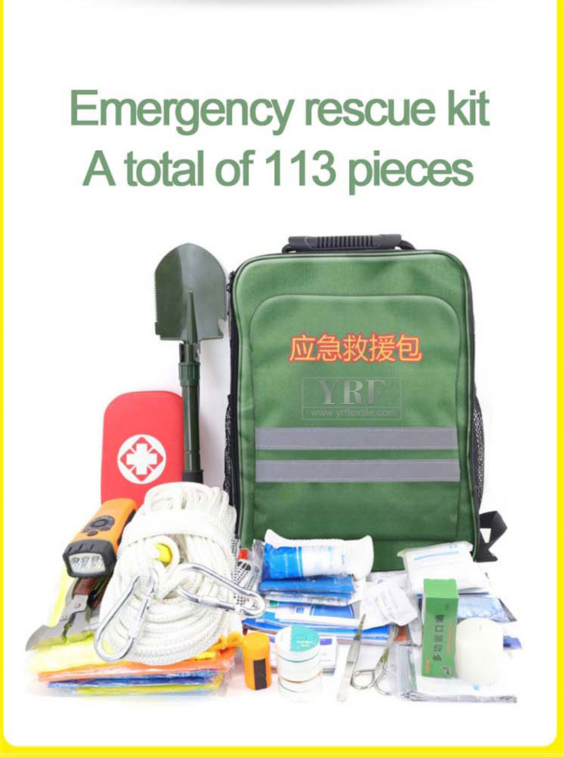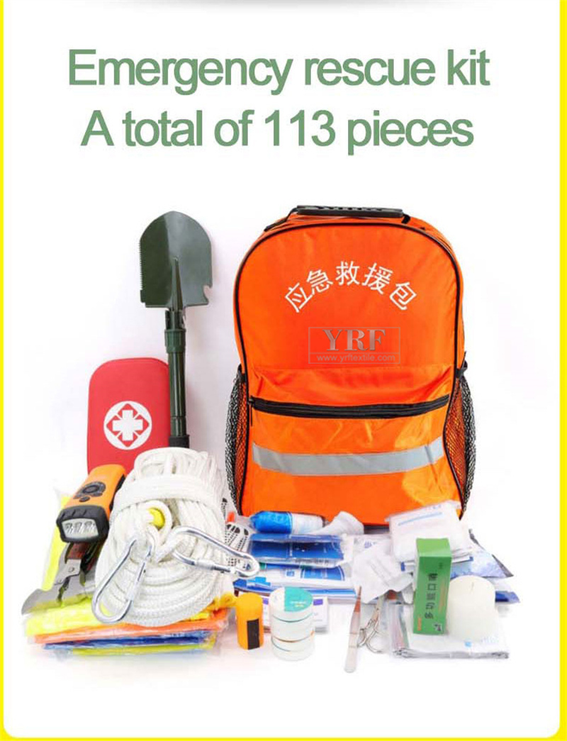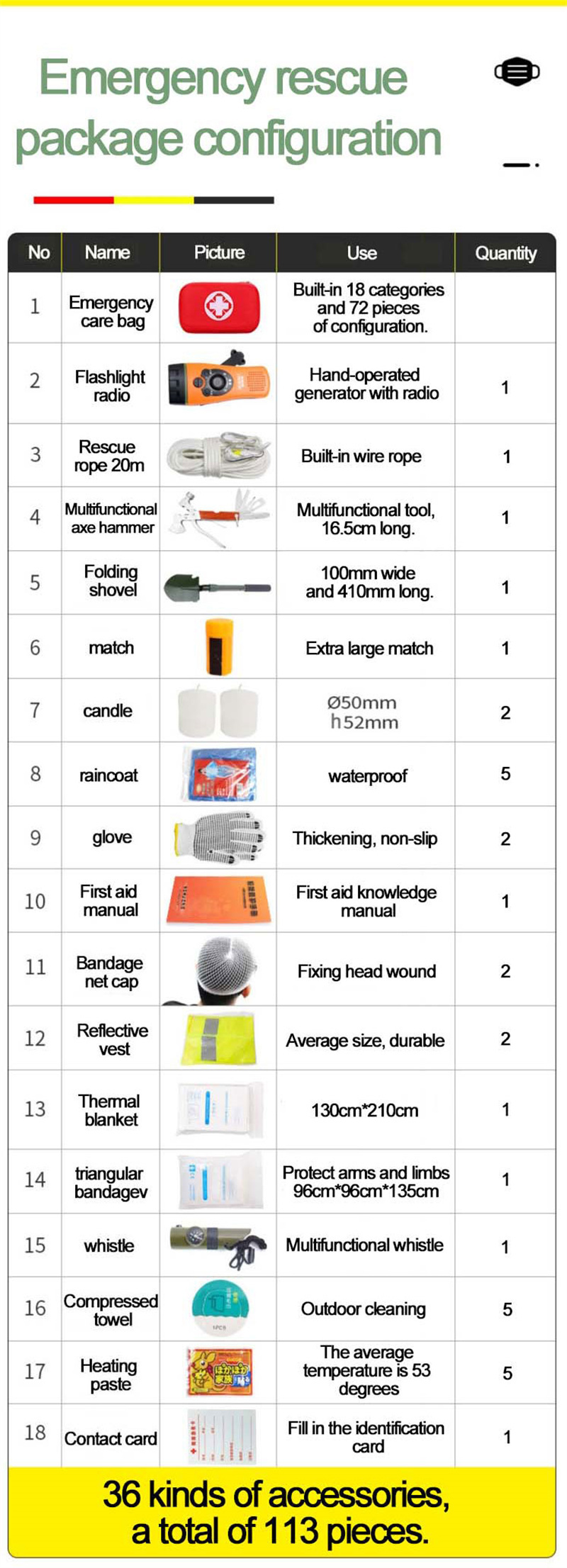 Kapak, lampu suluh 3 mod, Kad Pelbagai Fungsi, Gelang Kelangsungan Hidup, Wisel Dwi-tiub, Gergaji Dawai, Kord Payung Terjun, Selimut Kecemasan, peti pertolongan cemas yang komprehensif, dsb. |