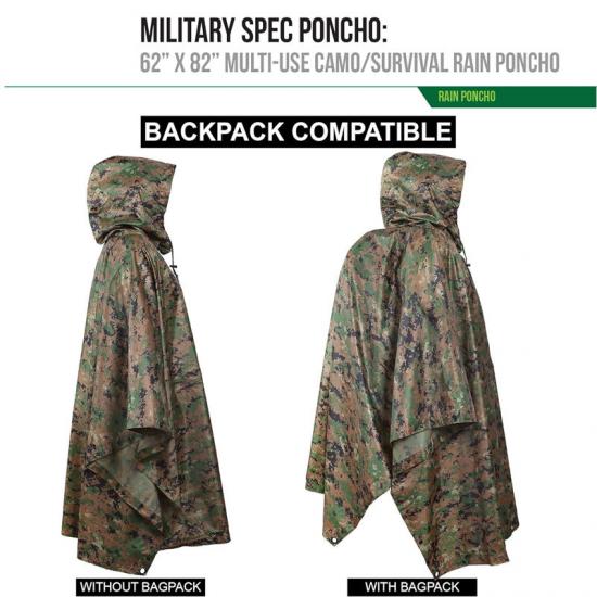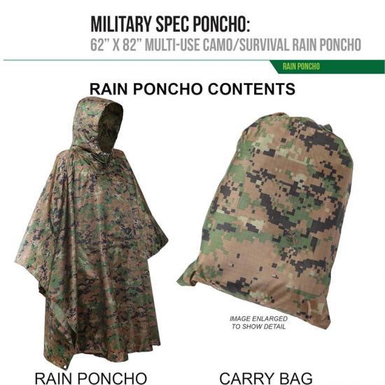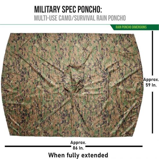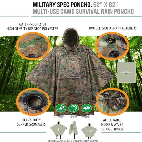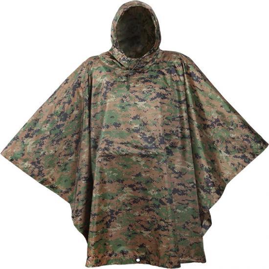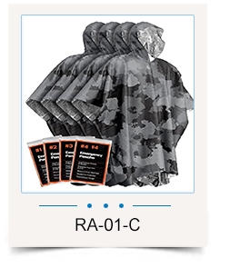 Kedua, dalam senario penggunaan ketenteraan, penebat pelapik Rain poncho bukan sahaja memberikan perlindungan daripada hujan, tetapi juga boleh digunakan sebagai alat penyembunyian. Poliester ripstop berketumpatan tinggi dan fabrik bersalut poliuretana memberikan prestasi kalis air yang sangat baik sambil mengurangkan lecet dan bunyi yang keras. Kemudahan dibawa dan kebolehlarasan poncho juga menjadikannya ideal semasa operasi taktikal.