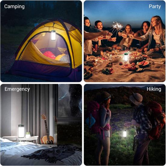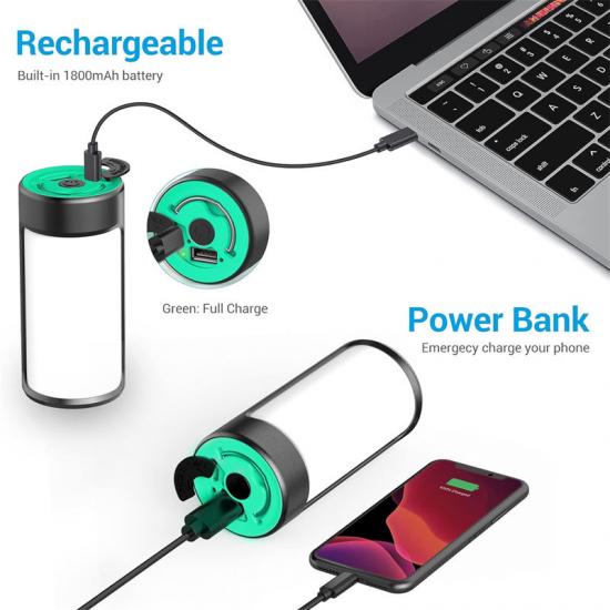 Penarafan kalis air IPX4 dan bateri boleh dicas semula 1800mAh terbina dalam, menghapuskan keperluan untuk penggantian bateri. Dengan reka bentuk cangkuk di bahagian atas, anda boleh menggantungnya di atas pokok atau di dalam khemah untuk pencahayaan yang lebih baik.