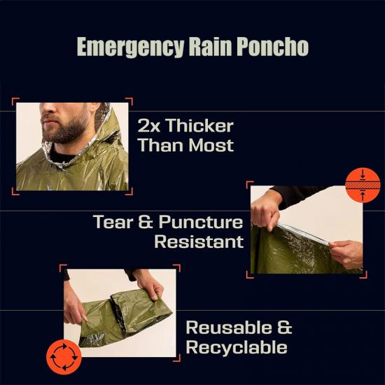 Baju Hujan kecemasan kami direka secara unik untuk menggabungkan fungsi Baju Hujan dan selimut terma menjadi satu, menjadikannya sesuai untuk digunakan sebagai peralatan hidup, peralatan penyelamat nyawa, beg galas, kit melarikan diri atau kit kecemasan automotif. Reka bentuk serba boleh ini membolehkan ia digunakan dalam pelbagai kecemasan, membantu anda bertindak balas dengan cepat apabila diperlukan.