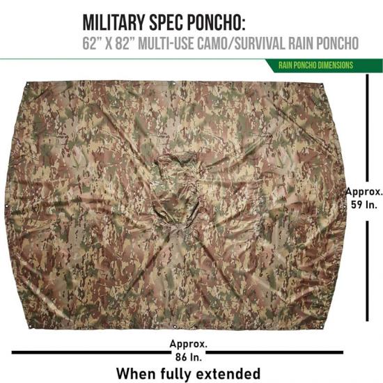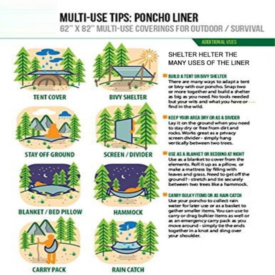 ini Kepelbagaian Poliester Pelapik Ponco Hujan: Pelapik Poncho Relief Rescue direka dengan tali pinggang yang memberikan kebolehlarasan tambahan 16 inci. Selain itu, poncho menggunakan 8 grommet logam tugas berat untuk memastikan pelapik poncho untuk penebat tambahan dan untuk kegunaan mudah sebagai lampiran tali. Ini bermakna ponco boleh digunakan bukan sahaja sebagai alat perlindungan hujan, tetapi juga sebagai payung, khemah kelangsungan hidup, pengumpulan air, beg galas bawa, pengusung kecemasan, penutup buaian, pembahagi khemah, skrin privasi, bunker tersembunyi dan banyak lagi. Fleksibiliti ini menjadikan Ponco Serbaguna berguna dalam pelbagai senario.