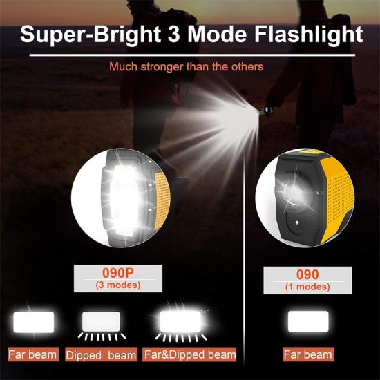Lampu Kecemasan Mod 3 +2: Radio Penyelamat Bantuan Mudah Alih dilengkapi dengan lampu suluh 3 mod ultra-terang dengan julat pencahayaan maksimum melebihi 10 meter, memberikan anda pencahayaan terang dalam gelap. Terdapat juga lampu membaca 2 mod dengan penderia gerakan yang boleh dimatikan secara manual dan automatik untuk membantu anda menjimatkan kuasa.