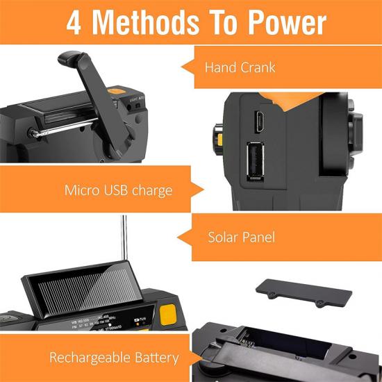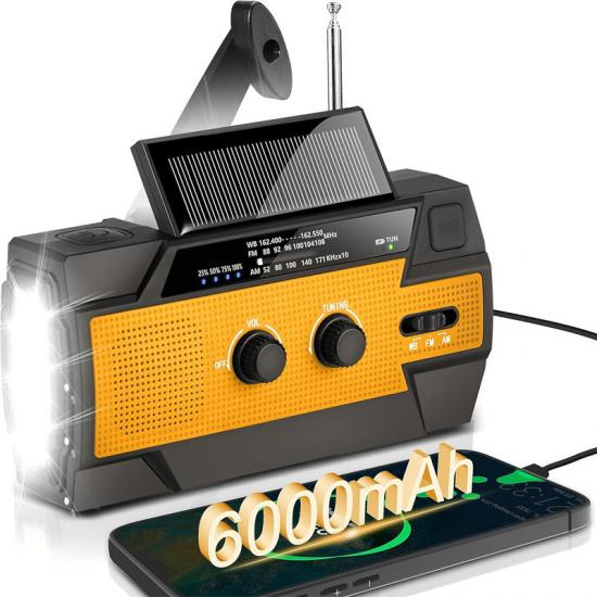 J: Radio Relief Rescue Durable ini mempunyai bateri boleh dicas semula 6000mAh, radio 3 jalur, lampu kecemasan mod 3+2 dan 4 kaedah penjanaan. Radio boleh menyediakan kuasa kecemasan untuk telefon bimbit, menerima siaran NOAA dan mempunyai pelbagai pilihan pencahayaan.
