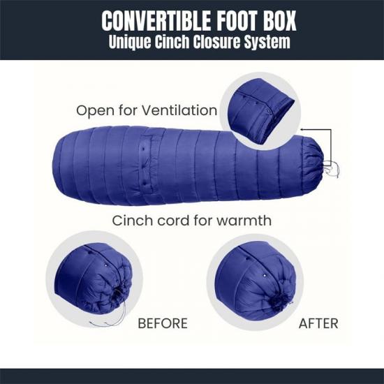 Kuilt atas ini juga boleh digunakan sebagai beg tidur dalam alas kaki boleh tukarnya, yang direka untuk meningkatkan kehangatan, keselesaan dan kecekapan dengan menyediakan penebat tambahan untuk kaki anda. Pada malam yang lebih panas, anda mempunyai pilihan untuk membuka alas kaki untuk meningkatkan peredaran udara. Dalam keadaan yang lebih sejuk, mengikat tali dengan ketat kemudian memberikan kehangatan optimum. Sama ada malam yang hangat atau persekitaran tidur yang sejuk, beg tidur Peralatan Penyelamat ini menawarkan keselesaan dan kemudahan.