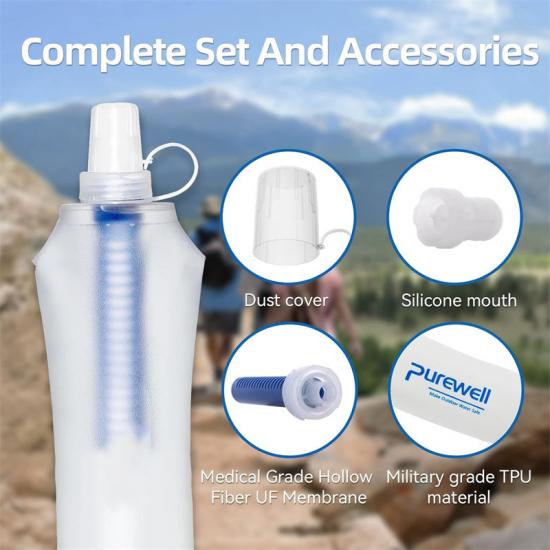 Botol air boleh lipat yang direka dengan bijak adalah kecil dan ringan, menjadikannya sesuai untuk diletakkan dalam beg galas kompak atau kit kecemasan. Pembersih Air Kualiti Kecemasan Bencana ini boleh dibawa dengan mudah ke mana sahaja pengguna berada, memastikan sumber air minuman bersih yang berterusan dalam persekitaran yang sukar. Reka bentuk penutup berkesan melindungi muncung daripada pencemaran luaran, memastikan ia bersih dan bersih dari semasa ke semasa.
