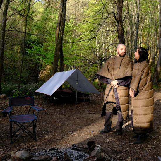 Kuilt atas juga boleh digunakan sebagai beg tidur dengan alas kaki boleh tukar yang menawarkan kehangatan, keselesaan dan kecekapan yang dipertingkatkan. Anda boleh memilih untuk memastikan alas kaki tetap terbuka untuk pengudaraan tambahan, manakala tali pengikat paling sesuai untuk tidur sejuk dan cuaca sejuk. Ciri ini amat penting dalam bantuan bencana kecemasan dan senario penyelamat kecemasan, kerana kaki adalah bahagian penting untuk memanaskan badan.
