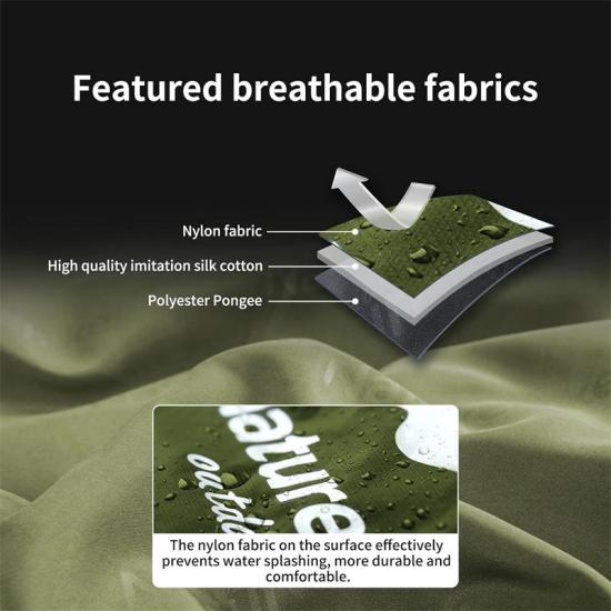 Bahan beg tidur pertahanan bernafas: Beg tidur kami diperbuat daripada bahan nilon dan poliester berkualiti tinggi yang sukar dipakai, tahan lama dan mudah dibersihkan. Isi kami diperbuat daripada kapas sutera palsu 80g/m², yang memberikan pengalaman tidur yang selesa dan juga merupakan penjimat ruang yang hebat.