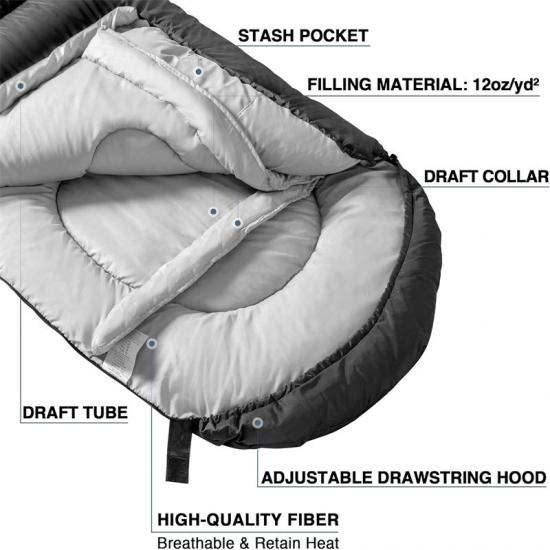 Kain cangkerang beg tidur simpanan hangat adalah kalis air dan angin untuk menahan kesan cuaca buruk. Kolar inset dan tiub kalis angin panjang penuh direka untuk memberikan keselesaan serta bertindak sebagai pengatur suhu. Bahagian separa bulat dengan kord boleh laras direka untuk memastikan kepala anda hangat dalam keadaan cuaca yang melampau.