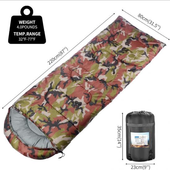 Beg tidur reka bentuk tahan lembapan berukuran 87x31.5 inci/220x80sm, yang sesuai untuk kebanyakan orang dewasa. Saiz ini menyediakan ruang yang cukup untuk memastikan anda boleh berehat dengan selesa pada malam yang sejuk. Dengan berat hanya 4 paun/1.8kg, beg tidur adalah ringan dan mudah dibawa, menjadikannya sesuai untuk penggunaan pantas dalam situasi kecemasan.