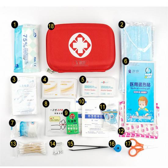Lap *10, mTopeng muka *5, Pembalut segi tiga *1, Tablet kapas Iodophor *10, Tablet alkohol *20, Tampalan demam *1, Pembalut elastik PBT *1, Topeng CPR *1, Pati minyak angin *1, Pad kain kasa *2, Pita *1, Alat bantu band *12, Penyapu kapas *1 *1, Tweezers keselamatan *1, Tweezers *1 Gunting *1, Peti pertolongan cemas *1
